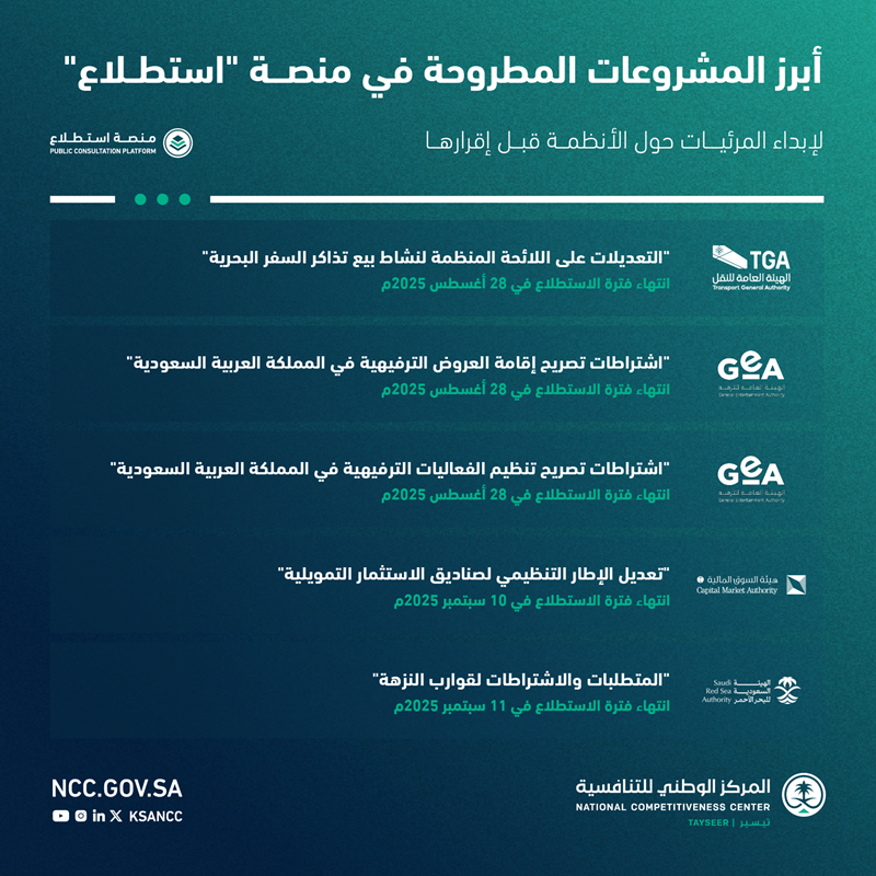 ​طرحت المنصة الإلكترونية الموحدة لاستطلاع آراء العموم والجهات الحكومية (منصة استطلاع) التابعة للمركز الوطني للتنافسية، 67 مشروعاً ذا صلة بالشأن الاقتصادي والتنموي، بالتعاون مع 18 جهة حكومية؛ لتمكين أصحاب المصلحة، من إبداء المرئيات والمقترحات حولها قبل إقرارها.