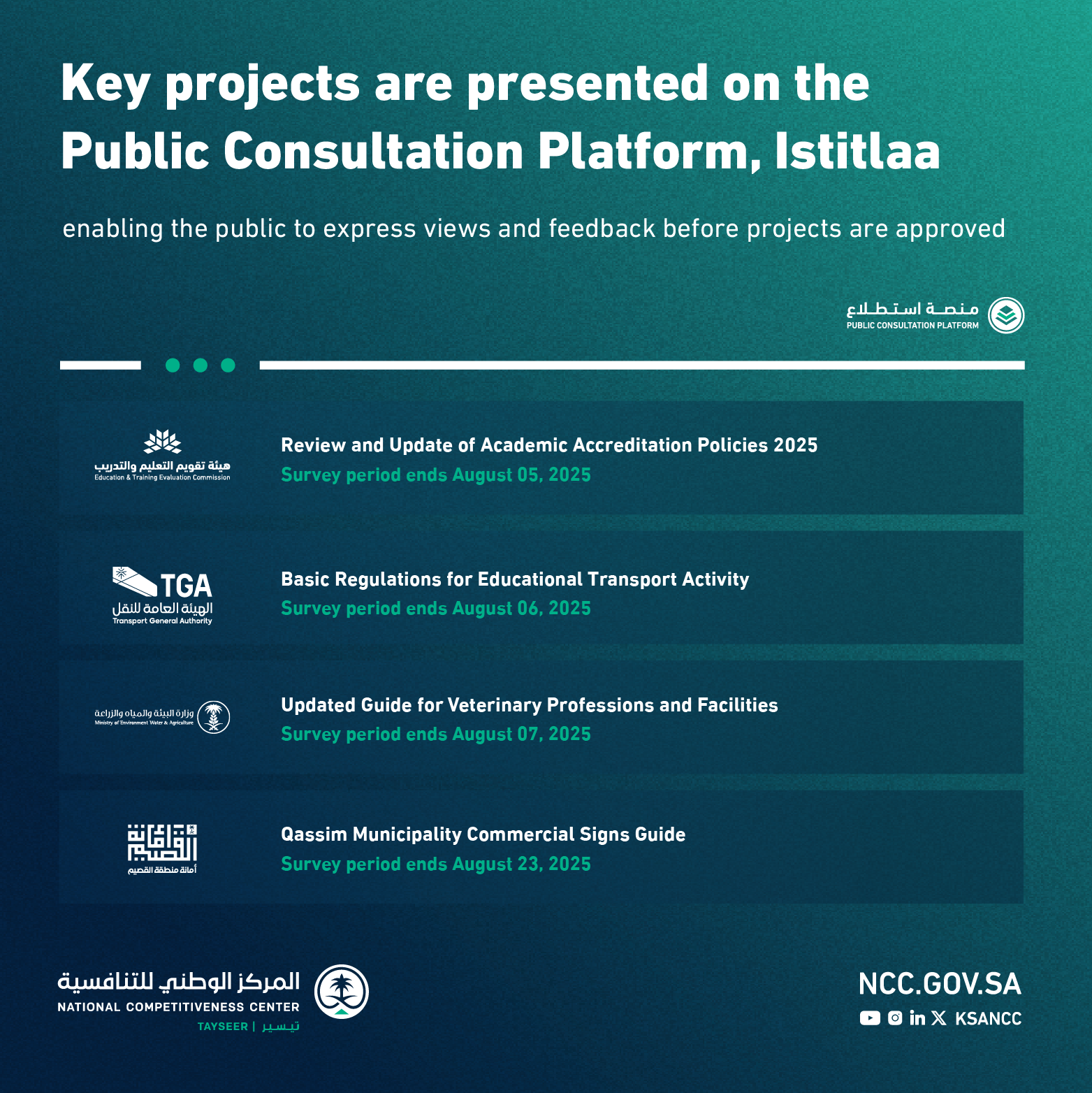 The National Competitiveness Center's Public Consultation Platform, Istitlaa, has put forward 37 projects related to economic and development affairs. In cooperation with 11 government bodies, the NCC invites the general public, government entities, and the private sector to express their views and feedback on projects prior to their approval.