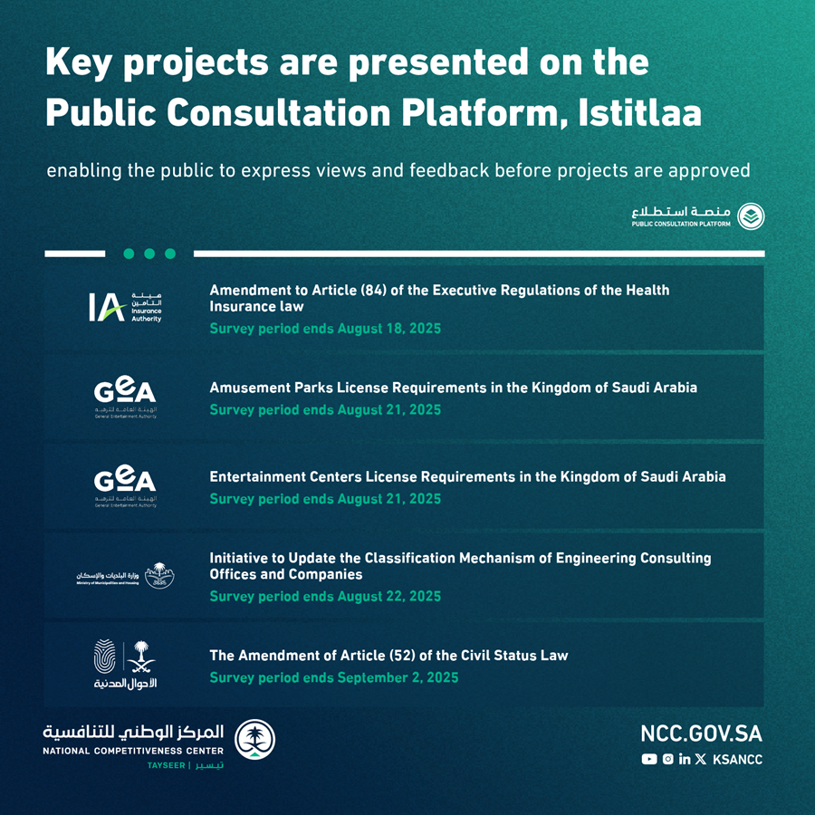The National Competitiveness Center's Public Consultation Platform, Istitlaa, has put forward 57 projects related to economic and development affairs. In cooperation with 19 government bodies, the NCC invites the general public, government entities, and the private sector to express their views and feedback on projects prior to their approval.