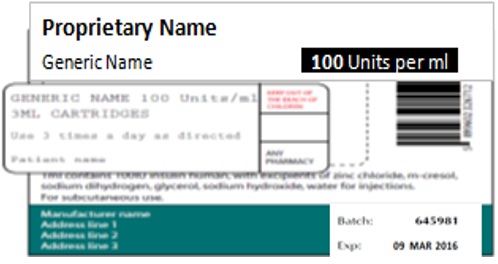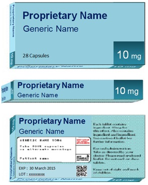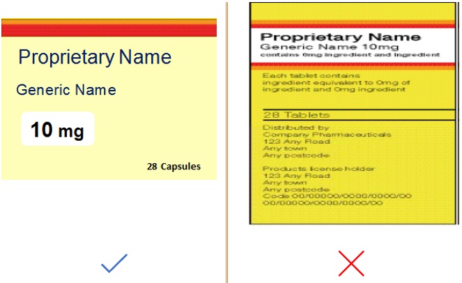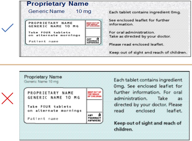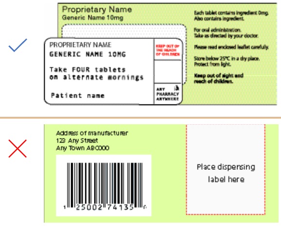 The brand name, generic name and strength of the product should be directly above or beside the space provided for the dispensing label. Pharmacy staff can then easily check that the product description on the dispensing label correctly matches that on the secondary packaging. Figure 8