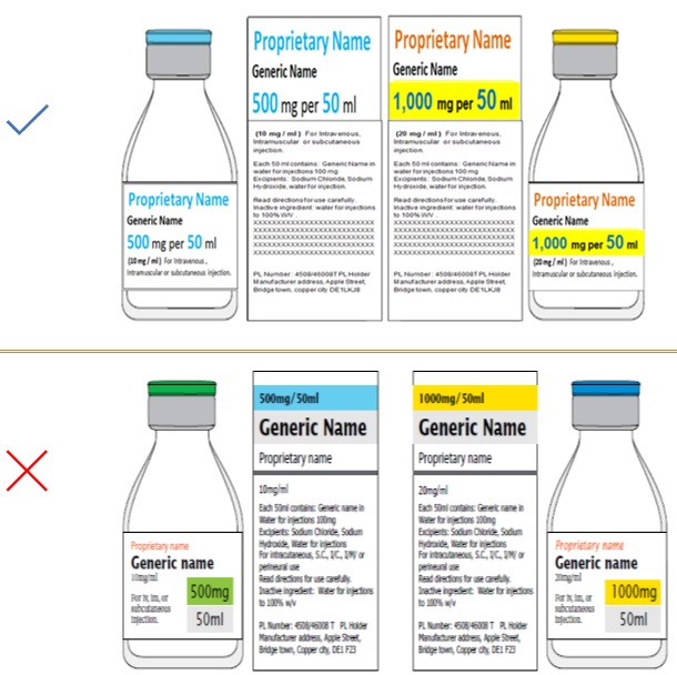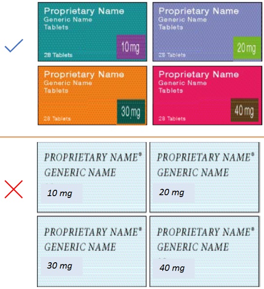 Use color to distinguish between, for example, different strengths of the same pharmaceutical product and between similarly named pharmaceutical products. Figure 26