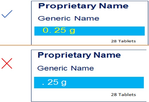 In addition, different strengths of the same pharmaceutical product should be expressed in the same way, such as 250 mg, 500 mg, 750 mg. (e.g., 500 mg, not 0.5 g) Figure 15