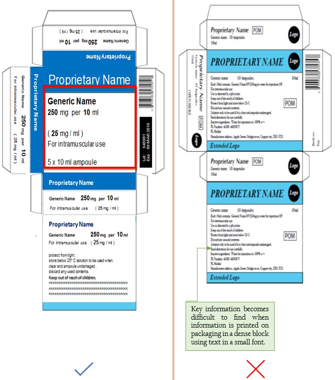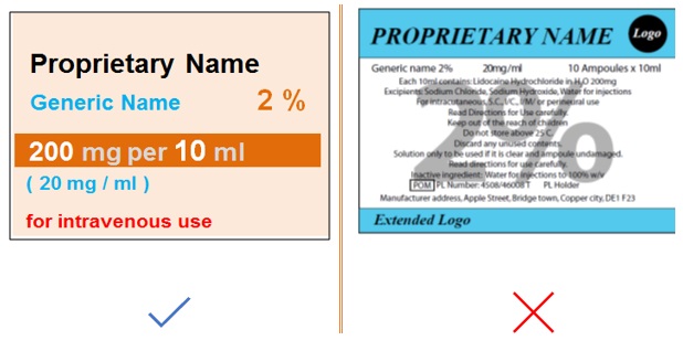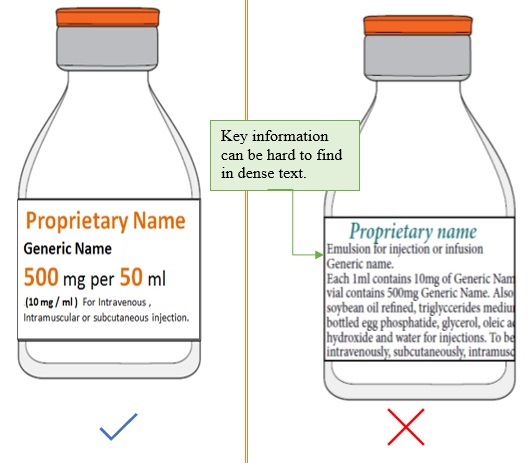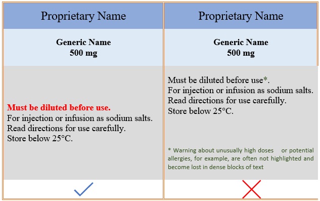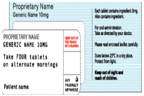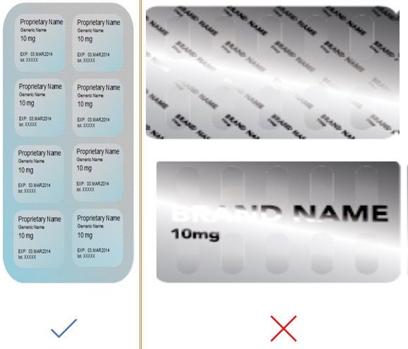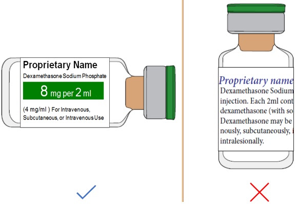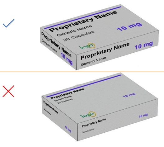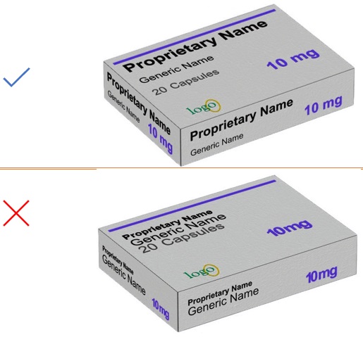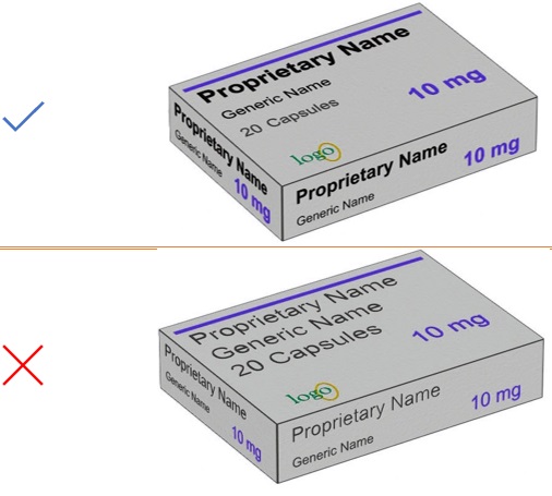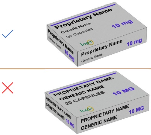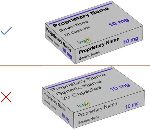 Use appropriate font size and formatting to enable the generic drug name to be read in one glance. The generic name should be at least 50% the size of the brand name. Figure 38