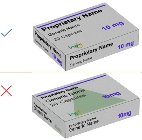 Make pharmaceutical product strengths stand out through typeface, font type color and shape. This is particularly important if all secondary packaging from a manufacturer looks similar. Figure 13