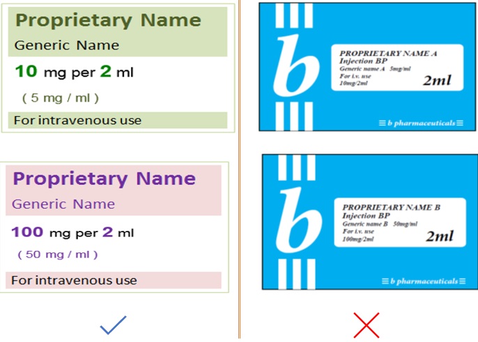 Consider the use of different colored components, for example, plungers or caps, to emphasize differences. Pharmaceutical products that come in a wide range of concentrations and doses can also be mistaken for each other.