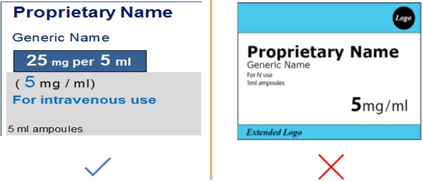 • Where concentrations are shown, they should be expressed as total quantity in total volume (e.g., 20 mg per10 ml) as well as the per unit volume (e.g., 2 mg/ mL).
