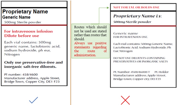 • Highlight the route of administration to avoid wrong route errors between products packed in plastic containers.
