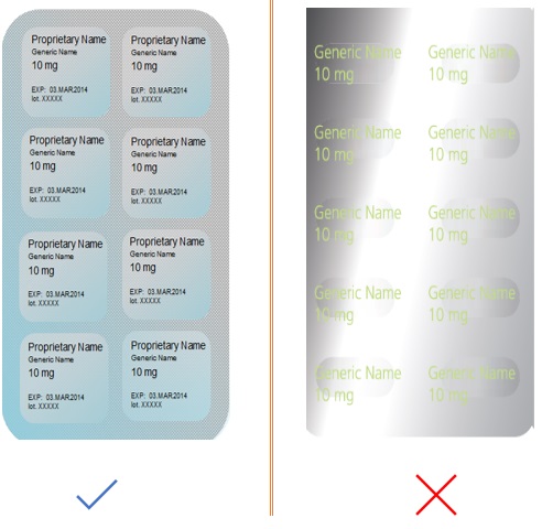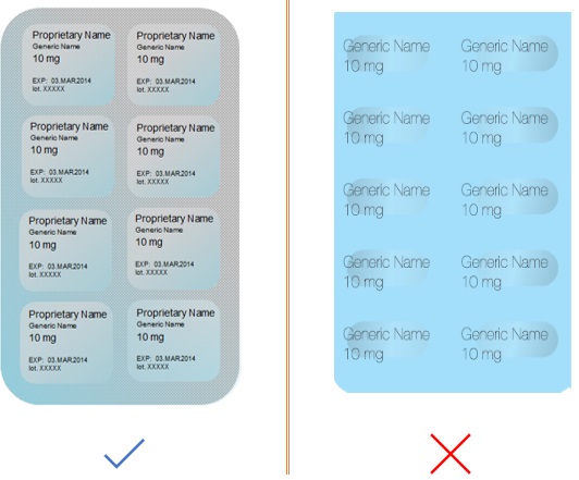 In certain cases (such as: small blister) it may not be possible to design the packaging to accommodate all critical information on each blister cell. In such circumstances, important information can appear multiple times across the back of the blister or the important information should be displayed in such a manner that it is not destroyed or eliminated when dosage units are removed.