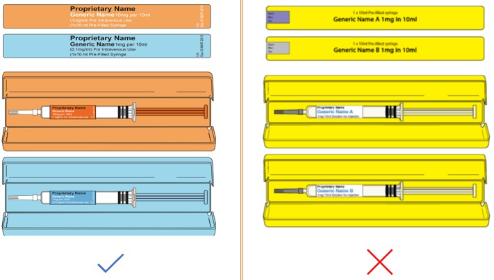 Vary the design of the secondary packaging of similar products to enable easy identification. Pre-filled syringes that may be required during a medical emergency can be easily confused, especially when there is minimal differentiation on the outer packaging.
