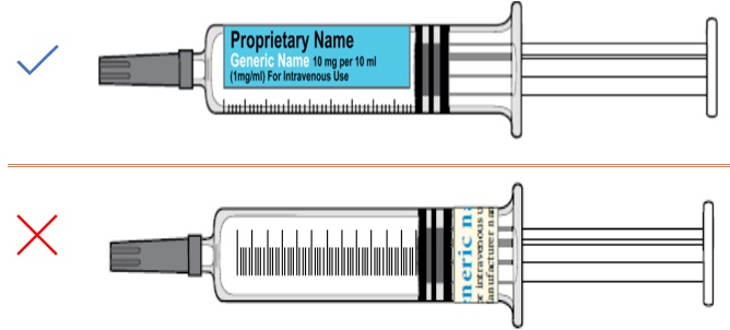 - We recommend the addition of a peel-off label on ampoules or vials, which can be transferred to a syringe in practice, will help practitioners avoid selection errors. All syringes containing pharmaceutical products should be labeled if they leave the operator’s hands. Figure 36