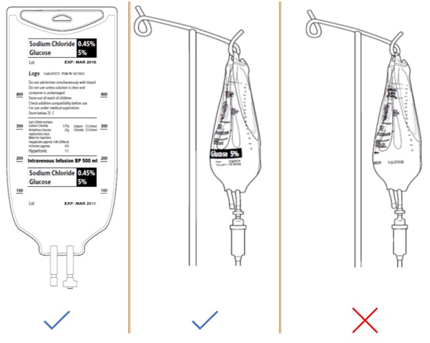 The critical information should be placed at the top of the bag; this information (especially the drug name and strength/concentration) should be repeated at the bottom of the bag so that as the bag empties it can still be visualized.