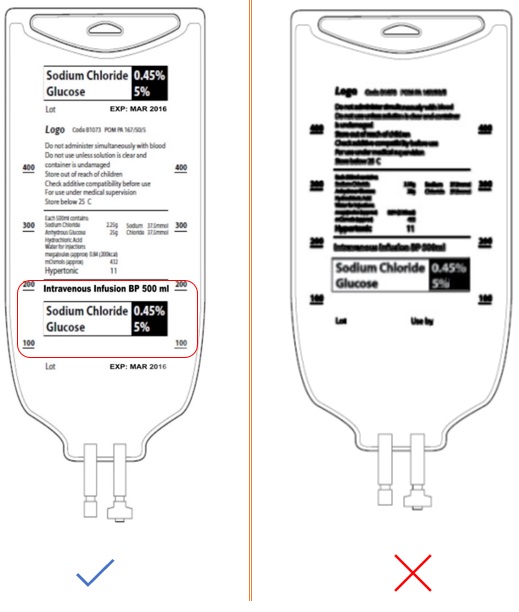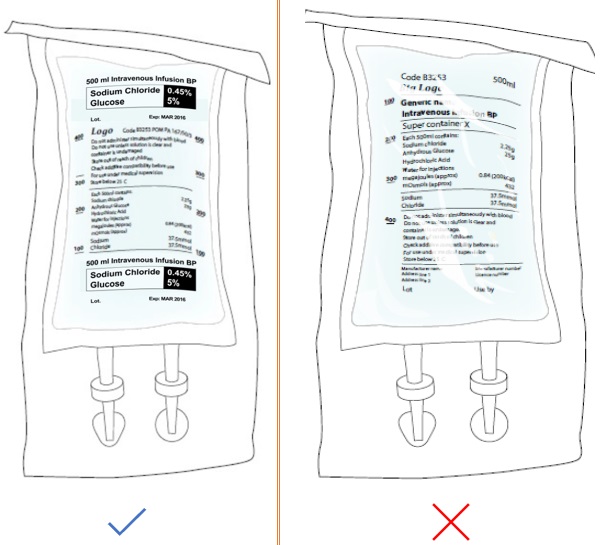 Use matte materials where possible to improve legibility. If materials used for the fluid bags and overwraps are reflective, the combination of the two materials can lead to impaired visibility of key information. Figure 49