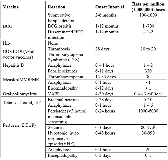 VaccineLocal adverse events (pain, swelling, redness)Fever (> 380C)Irritability, malaise and systemic symptoms