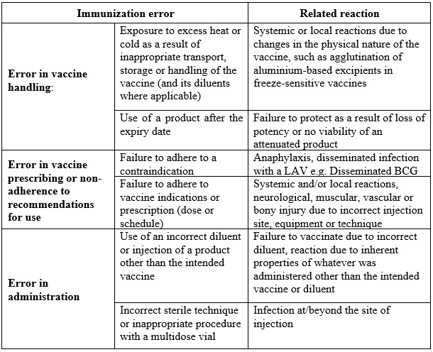 Immunization error-related reactions are usually preventable and they divert attention from the benefit of the immunization programme. Some of them are described in Table 2.5. The identification and correction of these errors in a timely manner are, therefore, of great importance.