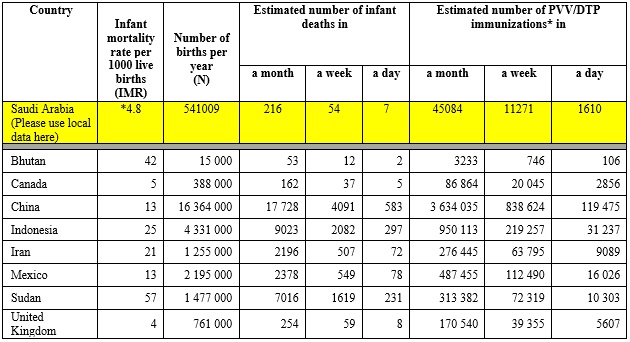 A calculation is shown in Table 2.6 relating to the incidence of infant (under one year) deaths in selected countries to the number of deaths temporally associated with routine DTP or pentavalent vaccine (PVV) immunization. As shown, infant mortality rates result in coincidental deaths in the day, week and month after immunization which are only temporally related to immunization. The actual number of coincidental deaths depends on the population size and infant mortality rate.